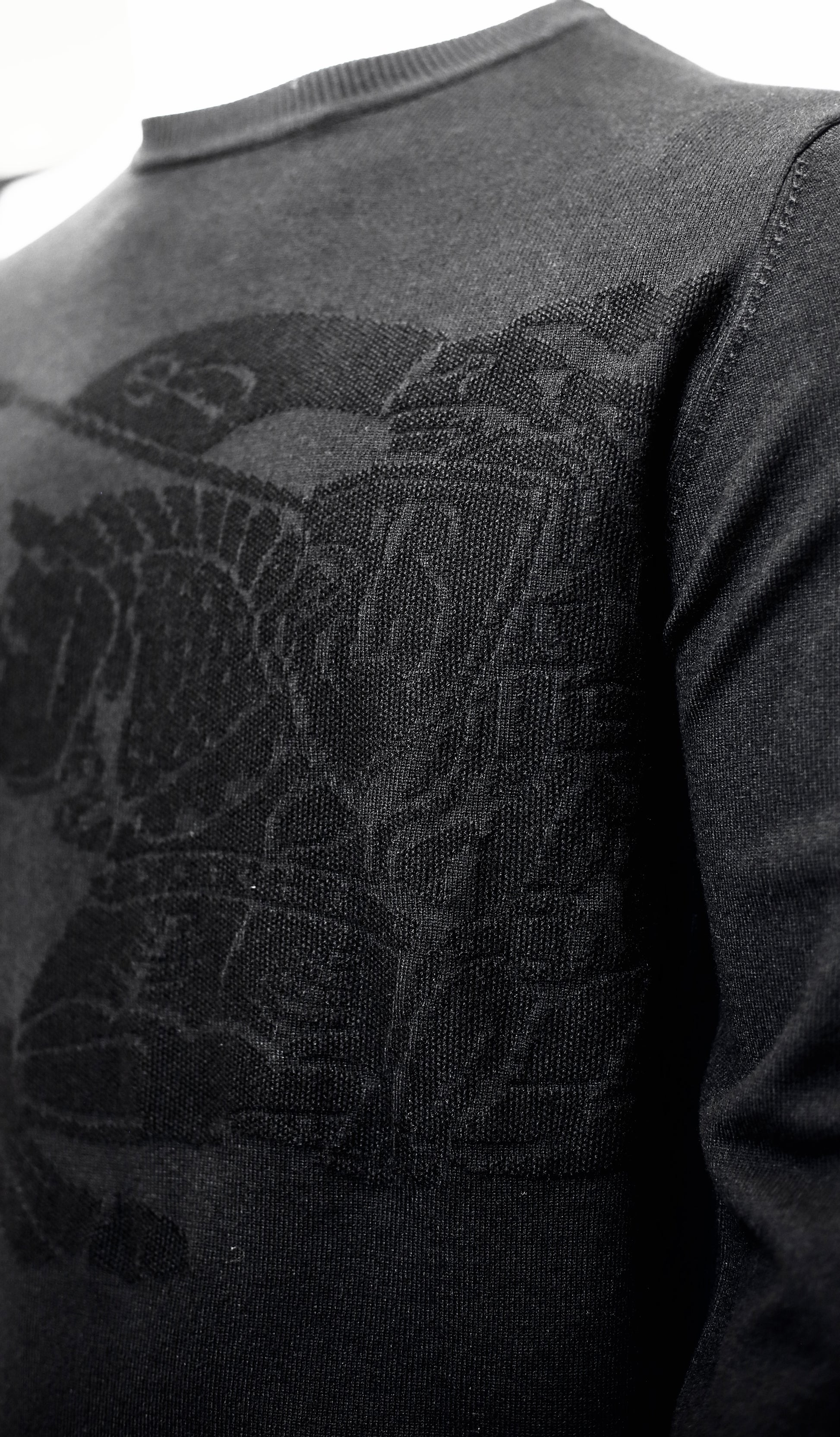Crafted from an exquisite, fine-gauge knit [Confirm: e.g., Merino Wool or Cashmere Blend], the sweater features a large, central Equestrian Knight Design (EKD) woven directly into the fabric. The design is rendered in a raised or jacquard technique, creating a subtle, three-dimensional texture that catches the light—a signature of elevated craftsmanship.