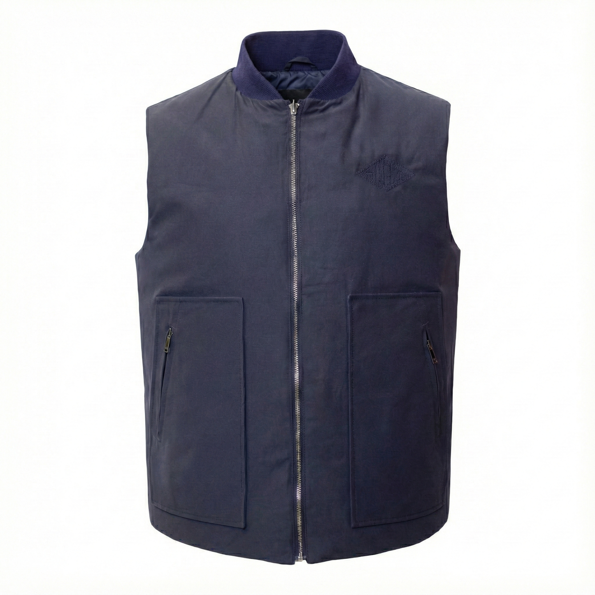 Premium Zipper Hardware: Features a polished, high-quality full-zip closure that glides smoothly, adding a touch of metallic contrast to the deep navy shell.