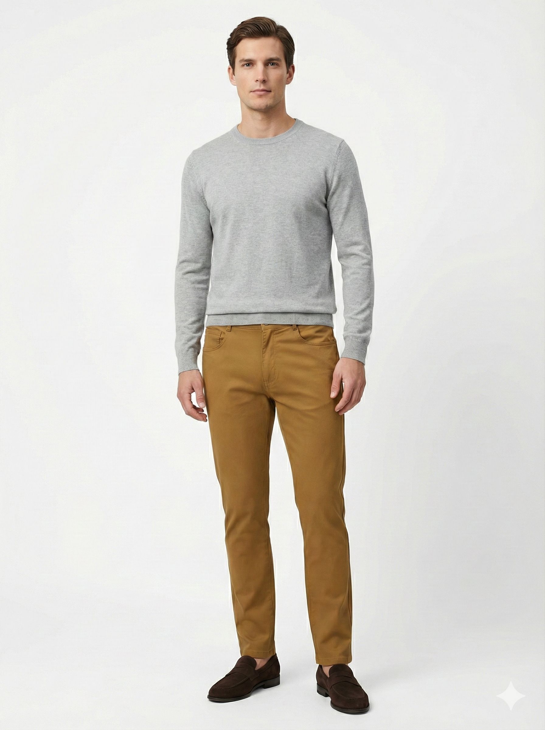 Weekend Refinement: Style the Khaki with a fine-gauge grey sweater and suede driving shoes for comfortable, sophisticated leisure.