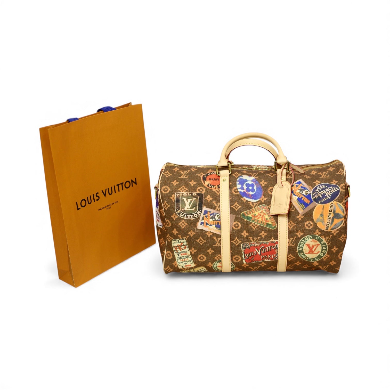 Capture the spirit of vintage travel with this extraordinary and highly collectible Louis Vuitton Keepall Bandoulière 50 in the vibrant Monogram World Tour (Stickers) design. A true collector's treasure, this iconic duffle bag transforms the timeless Keepall into a lively celebration of Louis Vuitton's heritage as the ultimate travel companion. Collectible Patches: Adorned with a striking arrangement of colorful, vintage-inspired "World Tour" patches, creating a unique and eye-catching aesthetic that tells a story of global adventure.