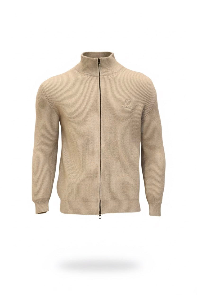 Crafted in Italy from a sumptuously soft Cashmere or premium Merino wool, the cardigan features a bold vertical rib knit that provides exceptional thermal regulation and a flattering, structured drape. The high funnel neck ensures maximum warmth, while the premium full-zip closure—often featuring a polished or leather-accented pull—offers versatile styling options.