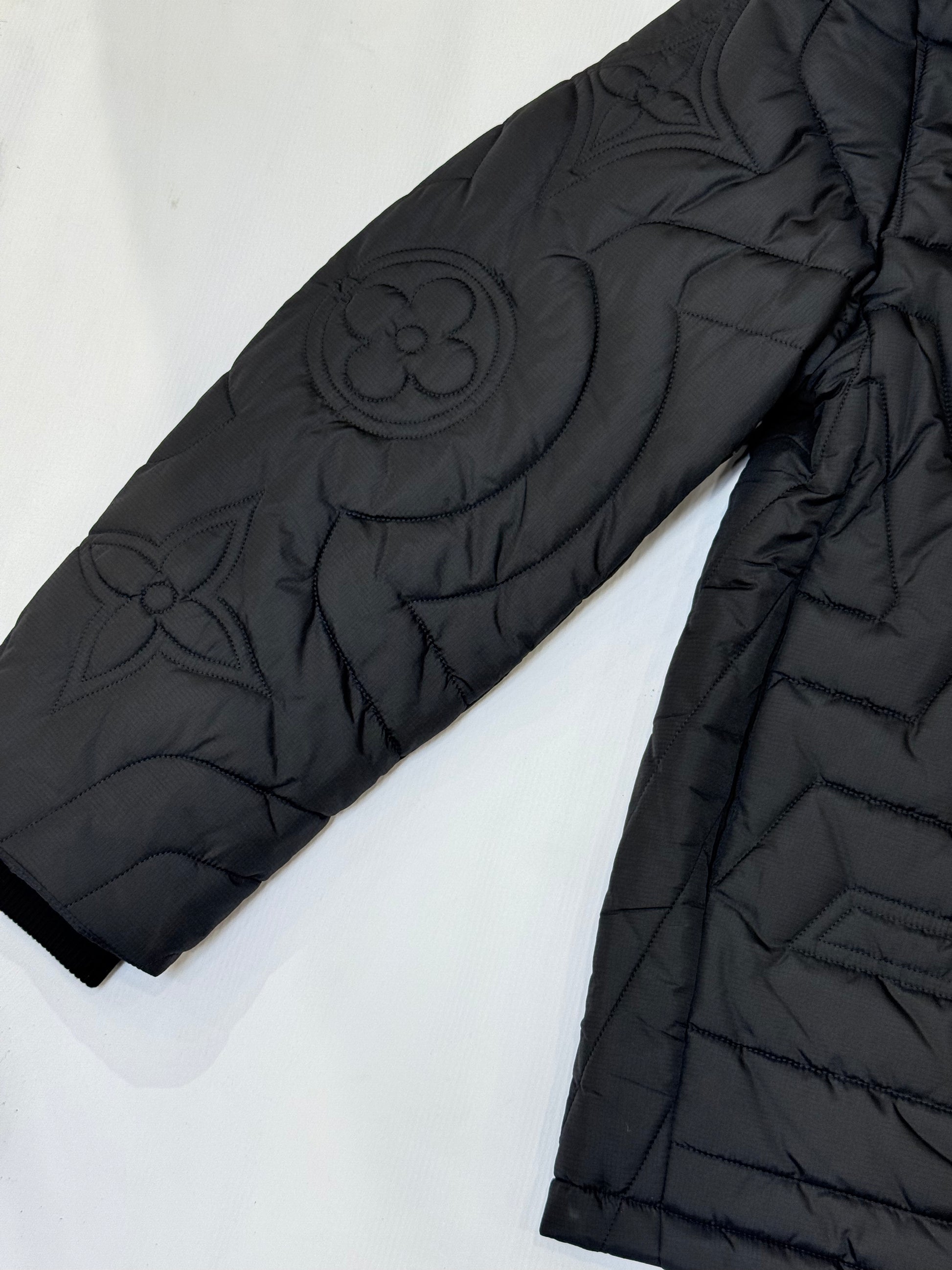 This jacket transcends simple utility, transforming insulation into a fashion canvas. It features an exclusive quilting pattern that integrates bold, unmistakable branding (inspired by the prominent LV signature) across the chest and a swirling, detailed motif on the sleeves.