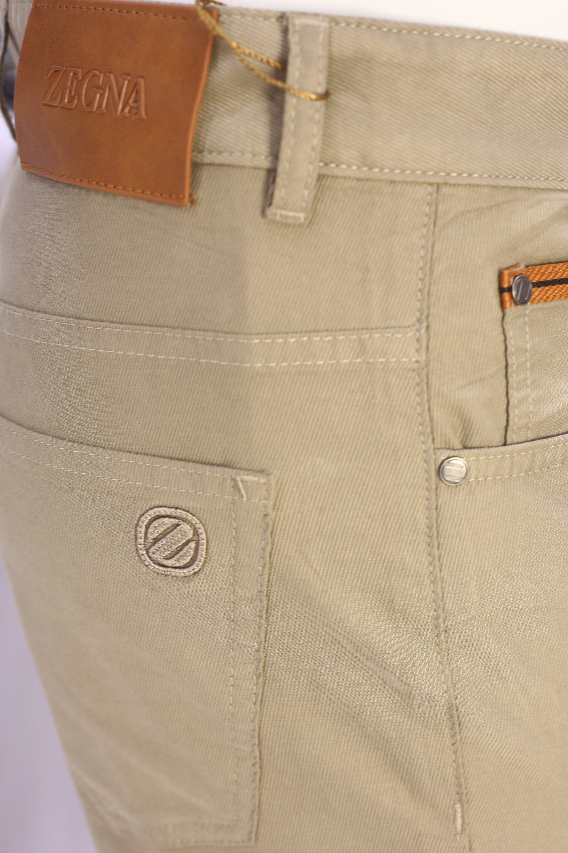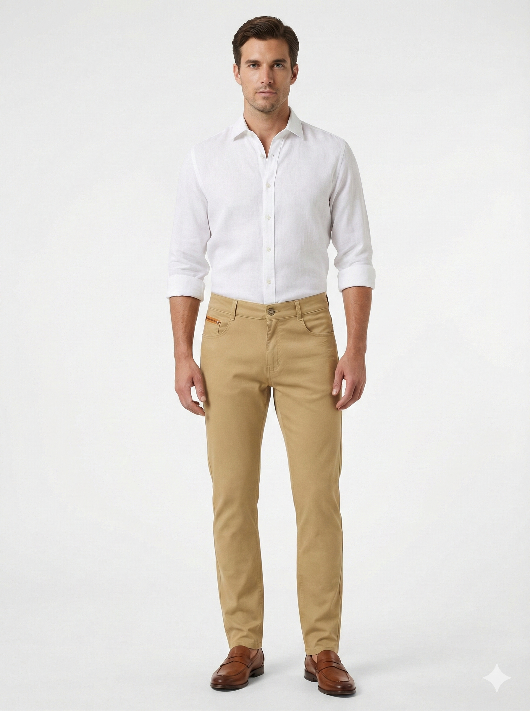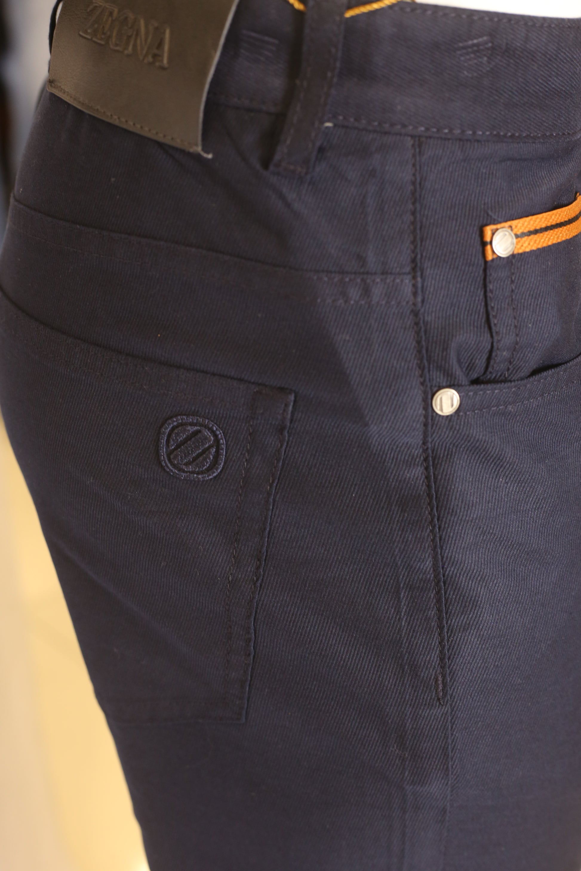 Product Type: 5-Pocket Trousers / Performance Chinos Brand: Zegna (Ermenegildo Zegna) Colors Available: Navy Blue, Khaki/Tan Look: Featured with a crisp white button-down shirt and polished leather loafers for a sharp, modern office look.